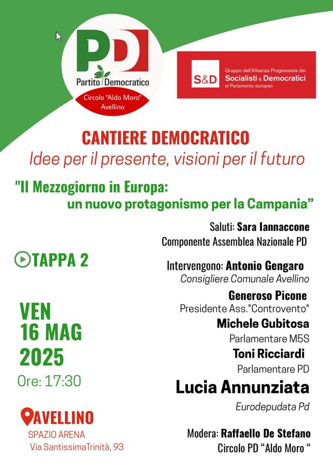 Il programma dei lavori, che saranno moderati da Lello De Stefano, prevede, dopo i saluti di Sara Iannaccone, componente assemblea nazionale del Pd, gli interventi di Antonio Gengaro, consigliere comunale di Avellino, Generoso Picone presidente Associazione "Controvento", Michele Gubitosa parlamentare M5S, Toni Ricciardi, parlamentare Pd.