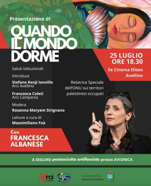 Siccome il governo tentenna, si rifiuta di sostenere l’accordo di partenariato tra l’Europa e Israele – che vergognoso – ma anche un memorandum di intesa con il governo israeliano che a gran voce tanti, anche Comuni, Regioni, continuano a portare avanti, siccome il governo nicchia, siccome il governo fa orecchie da mercante è necessario che ogni Comune – questo è quello che chiedo ai Comuni che mi hanno dato la cittadinanza o le chiavi della città e li ringrazio – se questo impegno è vero, allora impegnatevi per la Palestina, emettete ordinanze che invitano tutti i commercianti a non avere più prodotti Made in Israel. Questa è una cosa minima che si può fare, soprattutto fate pressione sul governo perché un’altra cosa vergognosa di questo governo, e lo dico con grande rammarico, è che ci sono tante università che hanno dato borse di studi a studenti palestinesi perché tutte le università sono state distrutte a Gaza, 11 università rase al suolo, e non c’è la possibilità di farli uscire dalla striscia di Gaza perché l’ambasciata italiana dice, ma non dovete venire a Gerusalemme. Ma vi rendete conto di quanto è cinica questa risposta. Quindi, ci deve essere una mobilitazione anche per far muovere le autorità a questo livello”. More images... Aggiornamento del 24 luglio 2025, ore 15.33 – Quando il mondo dorme, all’ex Eliseo la presentazione del libro di Albanese - “Quando il mondo dorme” è il titolo del libro di Francesca Albanese (Edizioni Feltrinelli), relatrice speciale Onu per i territori palestinesi occupati, che sarà presentato domani, venerdì 25 luglio, con inizio alle 18.30, presso l’ex cinema Eliseo di via Roma.