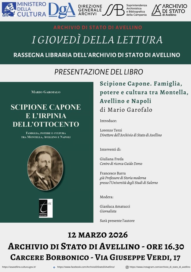 AVELLINO – L’Archivio di Stato di Avellino presenta un nuovo appuntamento della rassegna culturale “I giovedì della lettura”. Sarà presentato il volume: Scipione Capone. Famiglia, potere e cultura tra Montella, Avellino e Napoli di Mario Garofalo, pubblicato dal Terebinto Edizioni.