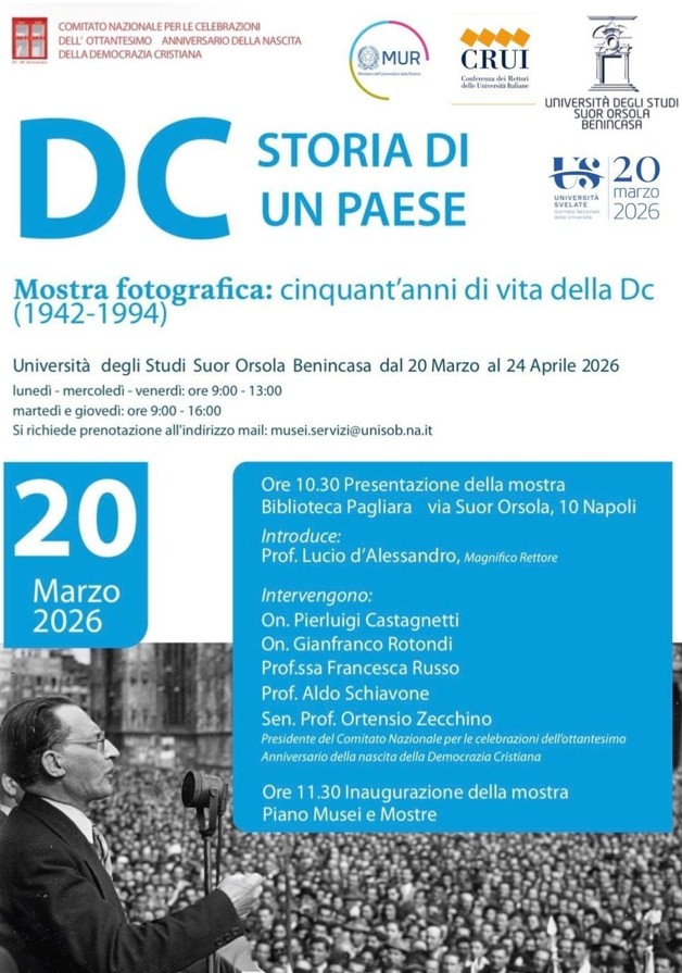 NAPOLI – In occasione dell’80° anniversario della nascita della Democrazia Cristiana, il Comitato nazionale per le celebrazioni promuove a Napoli la mostra fotografica “DC. Storia di un Paese”, in programma dal 20 marzo al 24 aprile 2026 presso l’Università degli Studi Suor Orsola Benincasa.