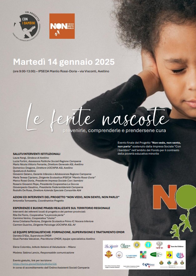 More images...Aggiornamento del 10 gennaio 2025, ore 15.49 – Si intitola “Le ferite nascoste” il convegno finale del progetto “Non vedo, non sento, non parlo”, selezionato dall’impresa sociale Con i Bambini nell’ambito del Fondo per il contrasto della povertà educativa minorile, e promosso dalla cooperativa sociale La Goccia di Avellino in qualità di soggetto capofila, nel bando Ricucire i Sogni - Iniziativa a favore dei minori vittime di maltrattamento.