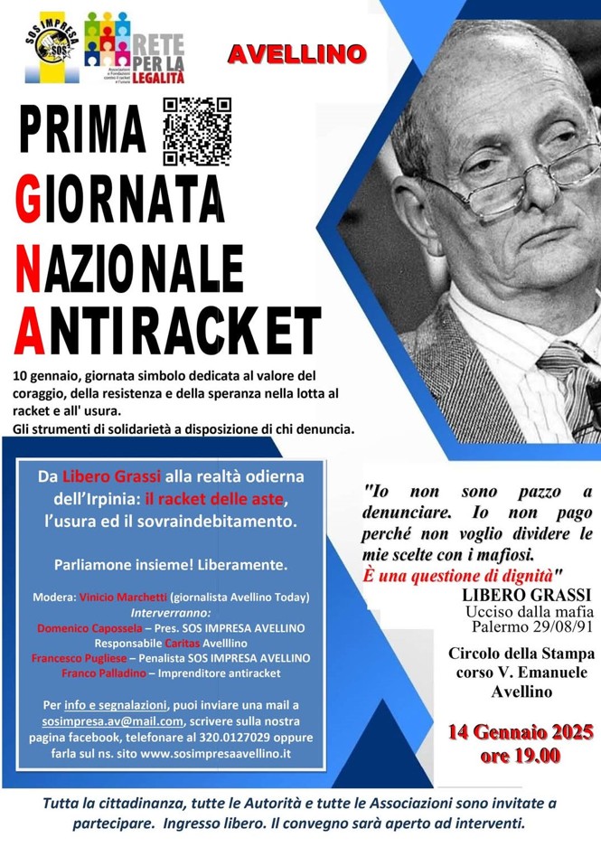 AVELLINO – In vista della proposta di legge per l’istituzione ufficiale del 10 gennaio come Giornata nazionale antiracket, la città di Avellino si prepara ad ospitare un importante evento il giorno 14 gennaio 2025, alle ore 19:00, presso il circolo della stampa di Avellino. Un evento volto a sensibilizzare la cittadinanza sulla lotta al racket e sulla necessità di promuovere la cultura della legalità.
