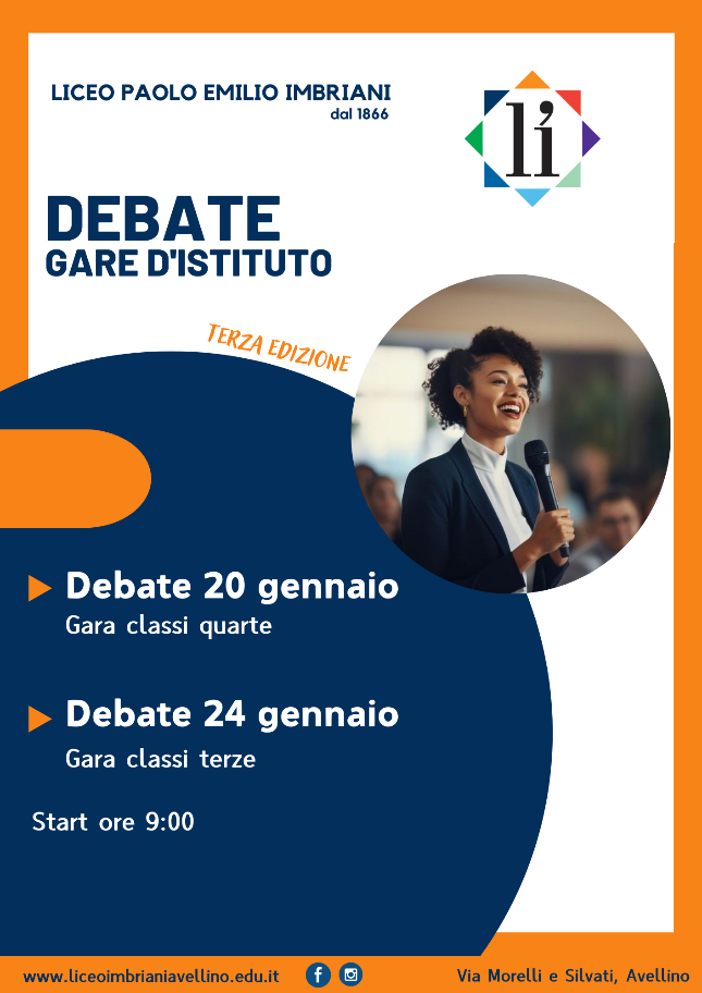 AVELLINO – Il liceo statale "Paolo Emilio Imbriani" si prepara ad ospitare la terza edizione delle gare di debate d’istituto, un appuntamento ormai consolidato che vede protagonisti gli studenti delle classi terze e quarte. L'iniziativa, curata dalla professoressa Maria Venezia, si svolgerà il 20 gennaio per le classi quarte e il 24 gennaio per le classi terze e, anche quest’anno, è stata preceduta da una attività di formazione, svolta, con il supporto dei docenti dell’istituto, dagli studenti più competenti verso chi si affacciava per la prima volta a questo interessante mondo del dibattito.