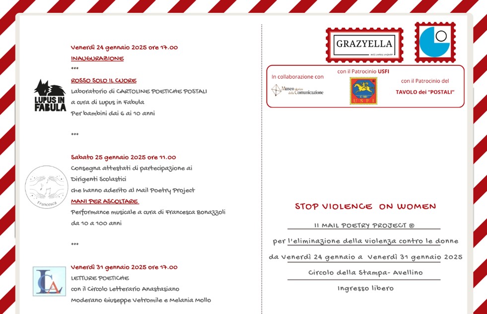 AVELLINO – Dal 24 al 31 gennaio 2025 il circolo della stampa di Avellino sarà il cuore di un evento unico: la mostra “Stop Violence Against Women”, parte della seconda edizione internazionale del Mail Poetry Project, un filone artistico ideato da Grazyella (nome d’arte di Graziella di Grezia).
