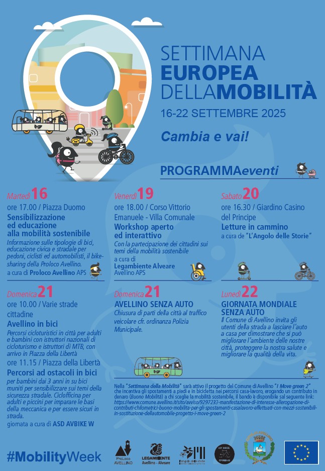 AVELLINO – Il Comune di Avellino ha aderito alla settimana europea della mobilità sostenibile, la campagna di sensibilizzazione più importante della Commissione europea sulla mobilità urbana sostenibile, dal tema "Mobilità per tutti", che si terrà come di consueto da 16 al 22 settembre.