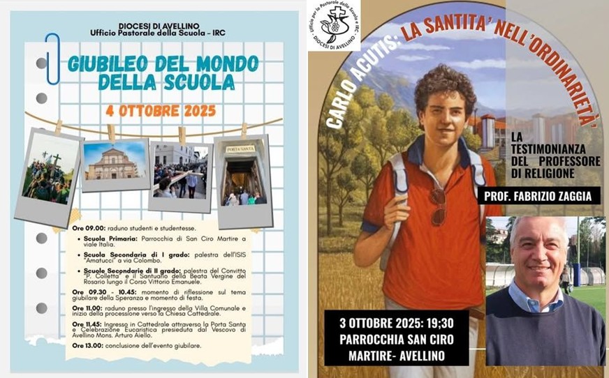 AVELLINO – Sabato 4 ottobre 2025 la diocesi di Avellino celebra il Giubileo della Scuola, una manifestazione rivolta a studenti, docenti, dirigenti e personale scolastico. Si inizia alle 9:30 con un momento di meditazione sul tema della Speranza, seguito da momenti di festa. Alle 11:00 studenti, studentesse e personale scolastico si radunano presso la villa comunale per partire in processione verso la Cattedrale del Duomo di Avellino. L’ingresso, previsto per le 11:45 attraverso la Porta Santa, sarà seguito dalla santa messa presieduta dal vescovo di Avellino, monsignor Arturo Aiello.