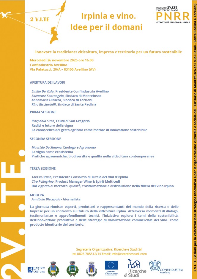 Per tale motivo, Ricerche e studi Srl, società di servizi di Confindustria Avellino, ha organizzato un ciclo di incontri dedicato a questo settore. Il workshop, organizzato in collaborazione con i Comuni di Montefusco, Santa Paolina e Torrioni, nell'ambito di un progetto di sviluppo dei Borghi storici, 2 V.I.TE, intende far emergere proposte mirate per il futuro della viticoltura irpina al fine di una migliore valorizzazione del territorio provinciale. L’incontro metterà a confronto prospettive produttive e commerciali, delineando le traiettorie di crescita di un settore chiave per l’economia del territorio.