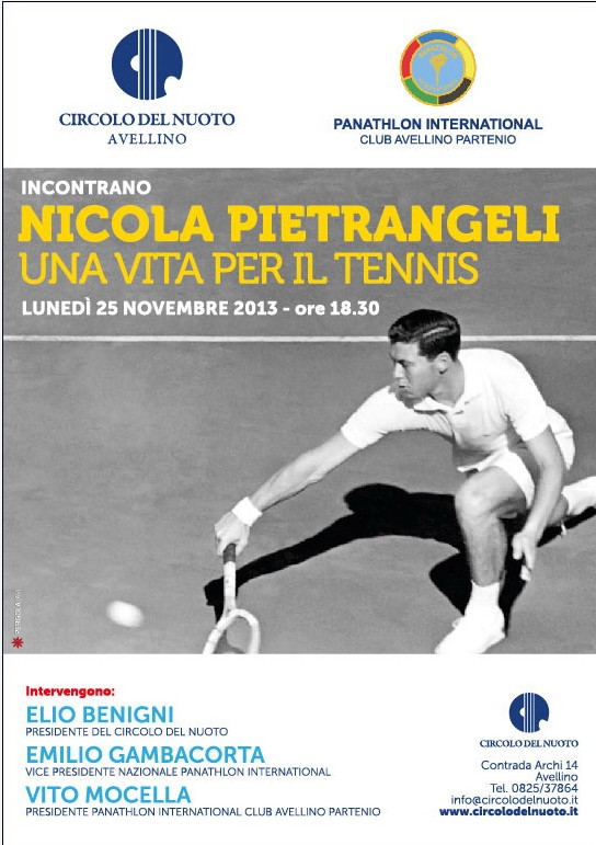 A confrontarsi con Pietrangeli, che vanta nel suo palmares 164 presenze da giocatore in Coppa Davis (con 120 vittorie), due successi al Roland Garros e due agli Internazionali d’Italia, 18 partecipazioni al torneo di Wimbledon, saranno Elio Benigni, presidente del Circolo del nuoto, Antonio Emilio Gambacorta, vice presidente del distretto Italia del Panathlon, e Vito Mocella, presidente del Club Avellino Partenio del Panathlon International.