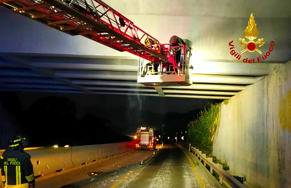 MONTORO - I vigili del fuoco di Avellino sono intervenuti oggi, 28 ottobre, poco dopo le ore 17:00, su richiesta della polizia stradale di Avellino, sul raccordo Avellino-Salerno, nel territorio del Comune di Montoro, al km 15,300, in direzione Salerno, per rimuovere calcinacci dalla trave del cavalcavia sovrastante. La squadra, con l'ausilio dell'autoscala, ha eliminato tutte le parti pericolanti e verificato l'integrità della struttura.