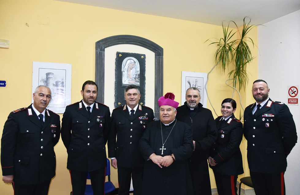 FRIGENTO – Nell'ambito della sua visita pastorale a Frigento, mons. Pasquale Cascio, arcivescovo dell'arcidiocesi di Sant'Angelo dei Lombardi-Conza-Nusco-Bisaccia, ha fatto tappa alla locale stazione dei carabinieri. Al termine dell'incontro, i militari hanno voluto omaggiare l’arcivescovo con un'immagine della "Virgo fidelis", patrona e protettrice dell'Arma dei carabinieri, il cui giorno di festa si celebra in tutta Italia il 21 novembre.