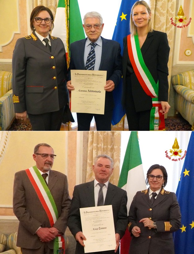 Tra gli insigniti figurano anche due vigili del fuoco in quiescenza, Carmine Addivinola e Luigi Tomeo, premiati per il loro spirito di abnegazione e il coraggio dimostrato nel corso di una lunga carriera al servizio del corpo nazionale.