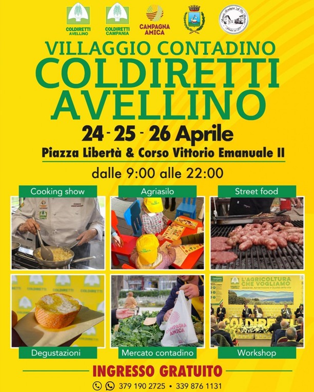 AVELLINO – Prende il via domani, venerdì 24 aprile, il Villaggio Contadino Coldiretti, che fino a domenica trasformerà Piazza Libertà e Corso Vittorio Emanuele II in una grande “città dell’agricoltura”, aperta a cittadini, famiglie e operatori. La manifestazione che porterà nel cuore del capoluogo irpino produttori, istituzioni ed esperti, con un programma ricco e articolato che intreccia divulgazione, formazione, degustazione e intrattenimento. L’evento è organizzato da Coldiretti Avellino con il patrocinio del Comune di Avellino.