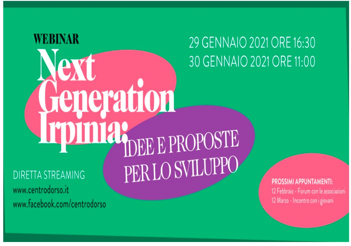 AVELLINO – Al via il secondo ciclo di webinar promosso dal Centro di ricerca “Guido Dorso” per riflettere sul futuro del Mezzogiorno e dell’Irpinia dopo la pandemia. Il 29 gennaio, alle ore 16,30 e il 30 gennaio alle ore 11,00 si terranno due incontri sul tema “Next Generation Irpinia: idee e proposte per lo sviluppo”, che vedranno la partecipazione di esponenti del mondo istituzionale nazionale, regionale e territoriale, religioso e civile.