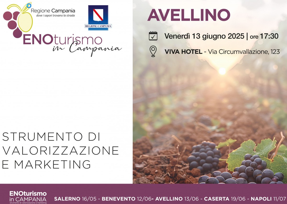 AVELLINO - In occasione dell’approvazione da parte della Regione Campania della nuova legge sull’enoturismo, venerdì 13 giugno ad Avellino presso il Viva Hotel, alle ore 17.30 si terrà l’importante iniziativa “Enoturismo in Campania – Strumento di valorizzazione e marketing”, confronto tra referenti del mondo vitivinicolo e turistico con l'obiettivo di approfondire e valorizzare il ruolo dell'enoturismo quale leva strategica per lo sviluppo territoriale. L’iniziativa è promossa dalla Regione Campania con il patrocinio del Consorzio di Tutela dei Vini d’Irpinia.