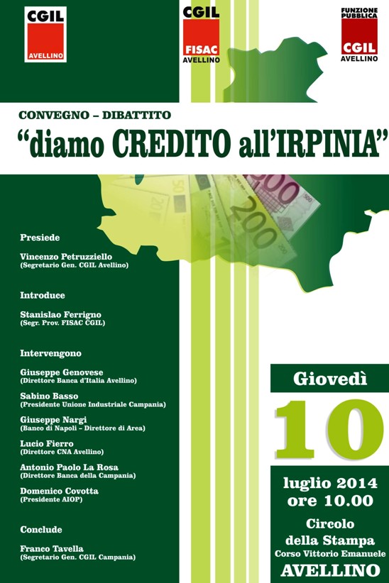 Il convegno sarà presieduto dal segretario provinciale della Cgil di Avellino, Vincenzo Petruzziello. Dopo l’introduzione di Stanislao Ferrigno, segretario provinciale della Fisac Cgil, sono previsti gli interventi di Giuseppe Genovese, direttore della Banca d’Italia di Avellino, Sabino Basso, presidente Unione Industriale Campania, Giuseppe Nargi, direttore di Area Banco di Napoli, Lucio Fierro direttore Cna di Avellino, Antonio La Rosa, direttore Banca della Campania, Domenico Covotta, presidente Aiop. Concluderà i lavori Franco Tavella, segretario regionale Cgil Campania.
