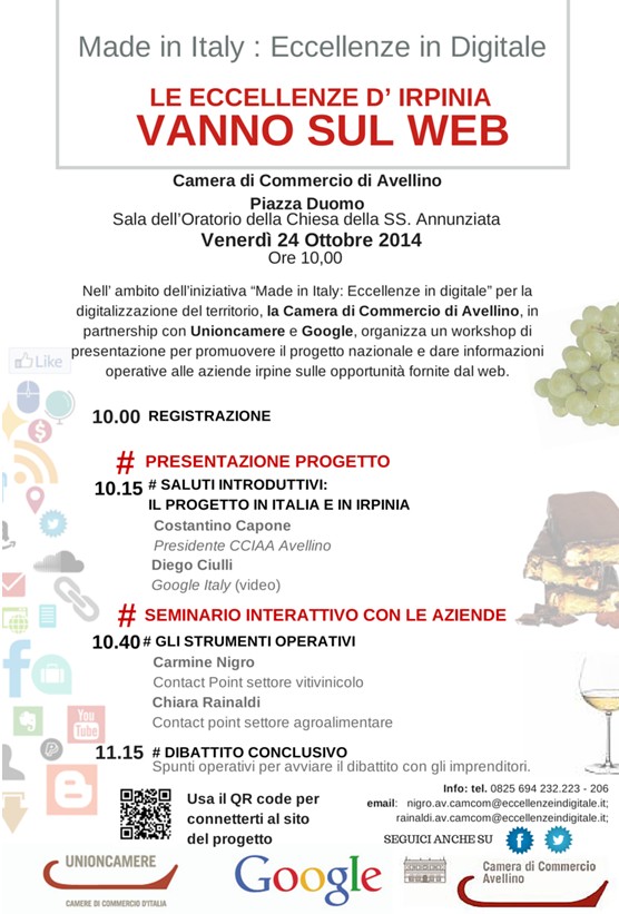 L’evento rientra nel programma Made in Italy: Eccellenze in digitale che vede coinvolto Google, il colosso della rete, insieme a Unioncamere, l’unione delle Camere di commercio italiane. Avellino punterà su due comparti: l’agro-alimentare in generale e la vitivinicoltura. Il primo passo sarà quello di selezionare le aziende da ammettere all’iniziativa. Poi, fino a febbraio 2015 per le imprese coinvolte saranno organizzati incontri one to one per conoscere le loro esigenze e gli obiettivi di sviluppo aziendale , in modo da potere tracciare un percorso personalizzato di digitalizzazione. Specialisti del web forniranno una consulenza mirata alle singole imprese sulla corretta impostazione del sito aziendale, sulla sua ottimizzazione nei motori di ricerca e sull’individuazione degli strumenti di promozione online, come l’e-commerce e i social media.