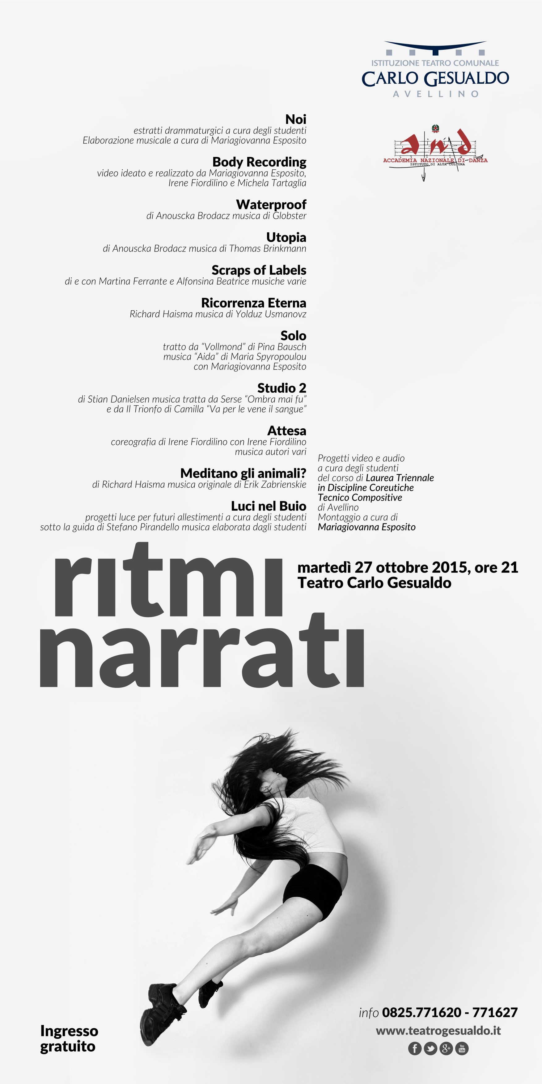 Martedì 27 ottobre, alle 21:00, con ingresso gratuito, presso il Teatro Carlo Gesualdo di Avellino va in scena “Ritmi narrati”, terza ed ultima produzione artistica del percorso formativo attivato dal 2012 grazie alla sinergia tra Accademia e Teatro.
