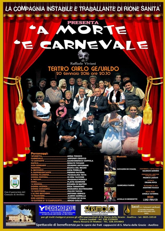 «Pur conservando uno spirito puramente amatoriale – sostiene il regista Luigi Frasca – la compagnia ha saputo costruire un percorso di gestualità e di linguaggio dialettale tipici della “napoletanità”, che hanno consentito di mettere in scena con successo grandi classici del teatro napoletano». “ ‘A morte e’ Carnevale”, sotto la direzione artistica di Luigi Frasca e Angela Caterina, vedrà protagonisti Anna Todisco, Antonio Cirocco, Renato Tizzano ,Giandomenico Coppola, Giuseppe Antignani, Bianca Del Regno, Luca Fiorillo, Pierino Pastena, Pasqualina Testa, Elvira Taccone, Pasquale Porcile, Flavia Morrone, M. Rosaria Di Matteo, Enza tarantino, Marianna Mastroianni, Fulvio Tuccia, Antonio Serpico, Albino Zarrella, Vittorio De Silva, Sergio Giglio e con la partecipazione di Franco Laudati e della costumista Oriana Roca.