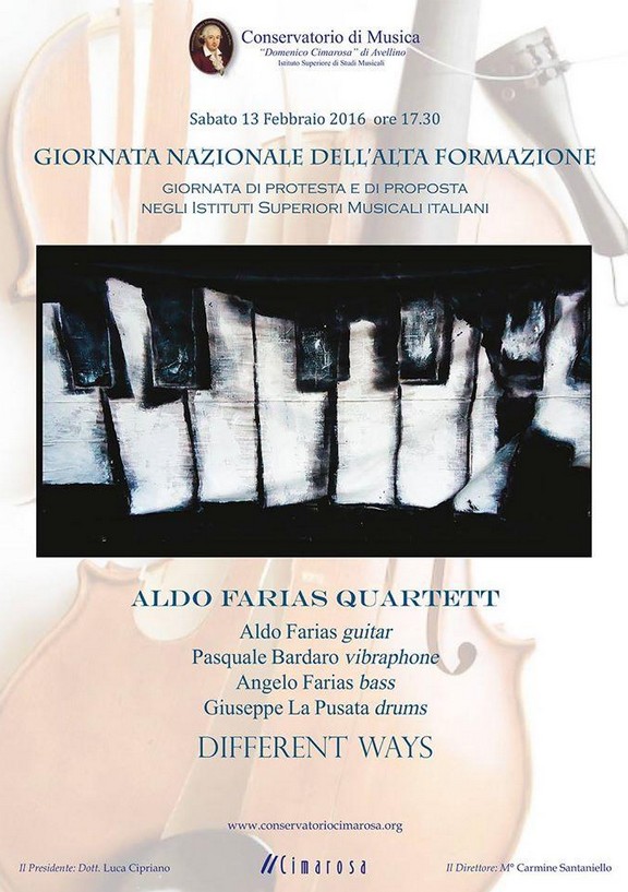 Questo in sintesi è l’oggetto della protesta-proposta che gli istituti musicali italiani avanzano e intendono farlo con il mezzo che è loro più consono: la musica. Per questo motivo, anche il Conservatorio di Avellino invita la cittadinanza ad assistere al concerto per la “Giornata nazionale dell’alta formazione” sabato 13 febbraio, alle 17,30. Sul palco del Cimarosa gli Aldo Farias Quartett, con Aldo Farias alla chitarra, Pasquale Bardaro al vibrafono, Angelo Farias al basso e Giuseppe La Pusata alle percussioni, per presentare i successi di Different Ways. Il disco, pubblicato dalla Wide Sound, contiene otto composizioni originali ed è la sintesi di una ricerca decennale tra la cultura tradizionale jazzistica e le contaminazioni con la musica europea.