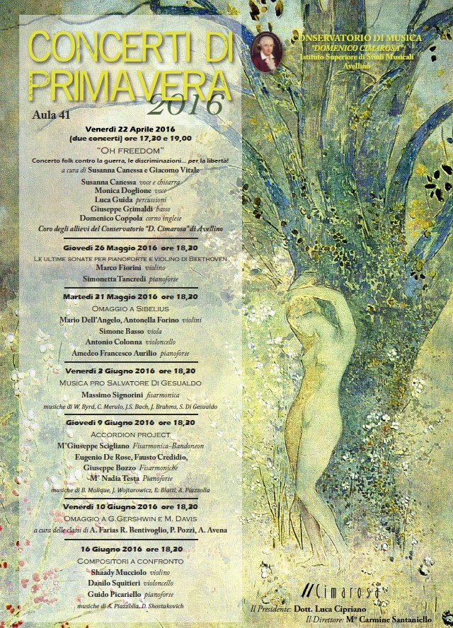 Si dichiara soddisfatto il direttore Carmine Santaniello nell’annunciare l’edizione 2016 della manifestazione Concerti di primavera: «Quest’anno, dopo il primo appuntamento dedicato alla musica folk, a essere presentato al pubblico avellinese sarà un ampio panorama compositivo che va da Beethoven a Sibelius, a Gershwin e Davis fino a Shostakovich, riservando due serate anche alla fisarmonica. Ce ne sarà, insomma, per tutti i gusti. La nostra offerta musicale da anni presenta ciò che nel conservatorio viene studiato, approfondito, scoperto ed elaborato, a scopo didattico, cercando un colloquio con l’ascoltatore, con la sua sensibilità e, nello stresso tempo, cercando di affiancare allo spettacolo un percorso di ascolto che, oltre a formare i fruitori, divenga motivo di riflessione. Speriamo che anche quest’anno la manifestazione susciti delle belle emozioni».