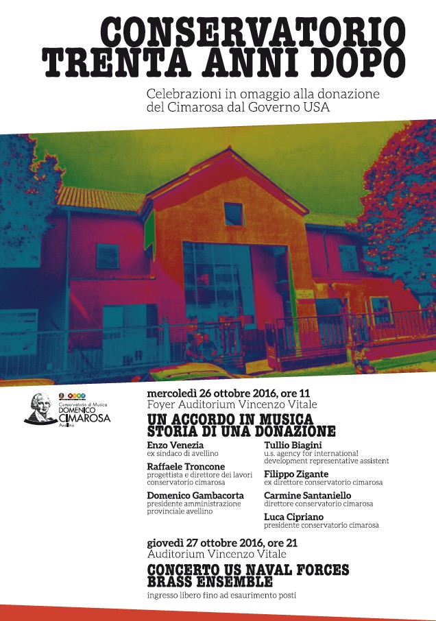 Le celebrazioni del «Cimarosa», in omaggio alla donazione del governo Usa, partiranno mercoledì 26 ottobre, alle ore 11:00, presso il foyer dell’auditorium «Vincenzo Vitale» (ingresso da Piazza Castello) con il convegno «Un accordo di musica: storia di una donazione» che vedrà la partecipazione del presidente della Provincia di Avellino Domenico Gambacorta, dell’ex sindaco di Avellino Enzo Venezia, di un familiare di Ettore Maggio, primo presidente del «Cimarosa», del rappresentante della U.s. Agency for international development Tullio Biagini, dell’ex direttore del Conservatorio Filippo Zigante e del progettista e direttore dei lavori Raffaele Troncone, che saranno accolti dal U.S. Naval Forces Europe/Allied Forces Band, organizzazione musicale multi-nazionale con sede a Napoli Capodichino, band ufficiale della Marina americana in Europa, capace di raggiungere un pubblico di oltre 60 milioni di persone in più di 35 paesi, grazie alle centinaia di performances che svolge ogni anno. Considerato l’alto numero di richieste, per assistere allo spettacolo di giovedì 27 ottobre sarà possibile ritirare da oggi pomeriggio, presso l’ufficio del direttore, un invito gratuito da esibire all’ingresso e accedere all’auditorium per assistere al presidente Luca Cipriano e dal direttore Carmine Santaniello.