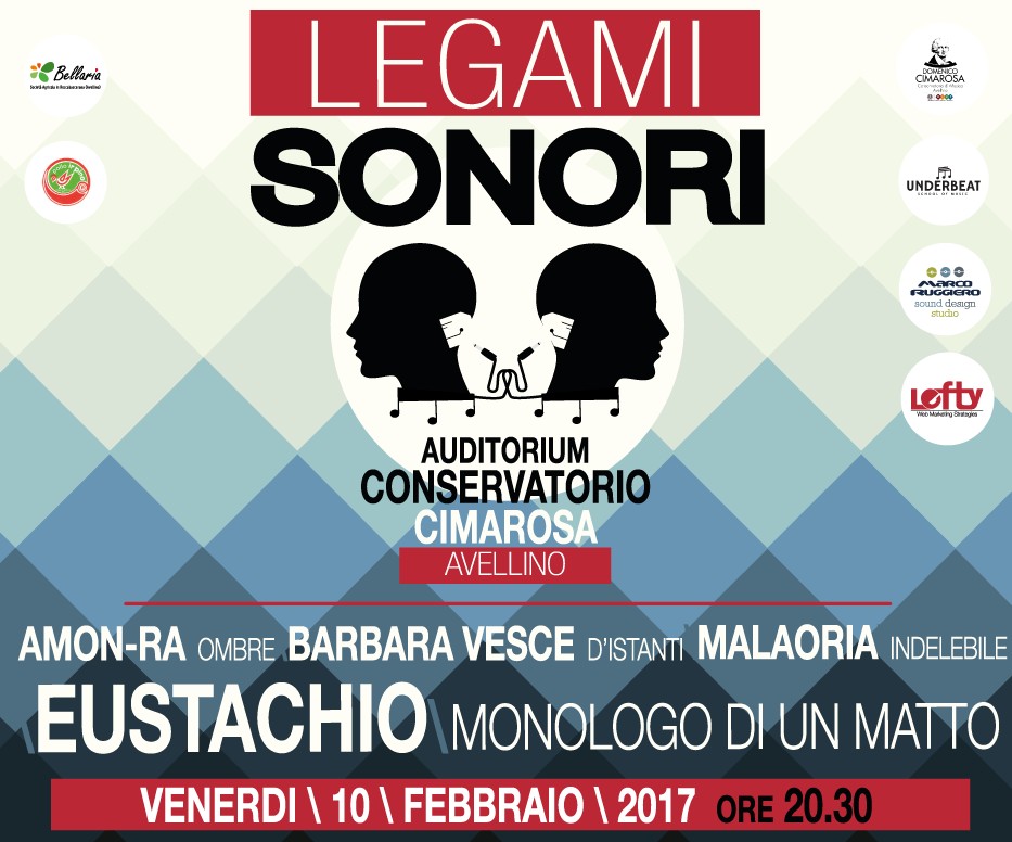 «Legami sonori» è un festival organizzato dall’Istituto di Alta formazione musicale presieduto da Luca Cipriano e diretto da Carmine Santaniello, in collaborazione con l’associazione Under Beat, Marco Ruggiero Sound Design Studio e la Web Marketing Agency Lefty, che vuole accendere i riflettori sulle produzioni musicali che nascono sul territorio irpino offrendo ai giovani artisti locali una scena di grande appeal come quella del «Cimarosa». Il concerto sarà ad ingresso gratuito fino ad esaurimento posti e vedrà alternarsi sul palcoscenico del rinnovato auditorium del «Cimarosa», in un’unica serata, quattro artisti del panorama musicale irpino come Eustachio, Amon-rA, Barbara Vesce e Malaoria.