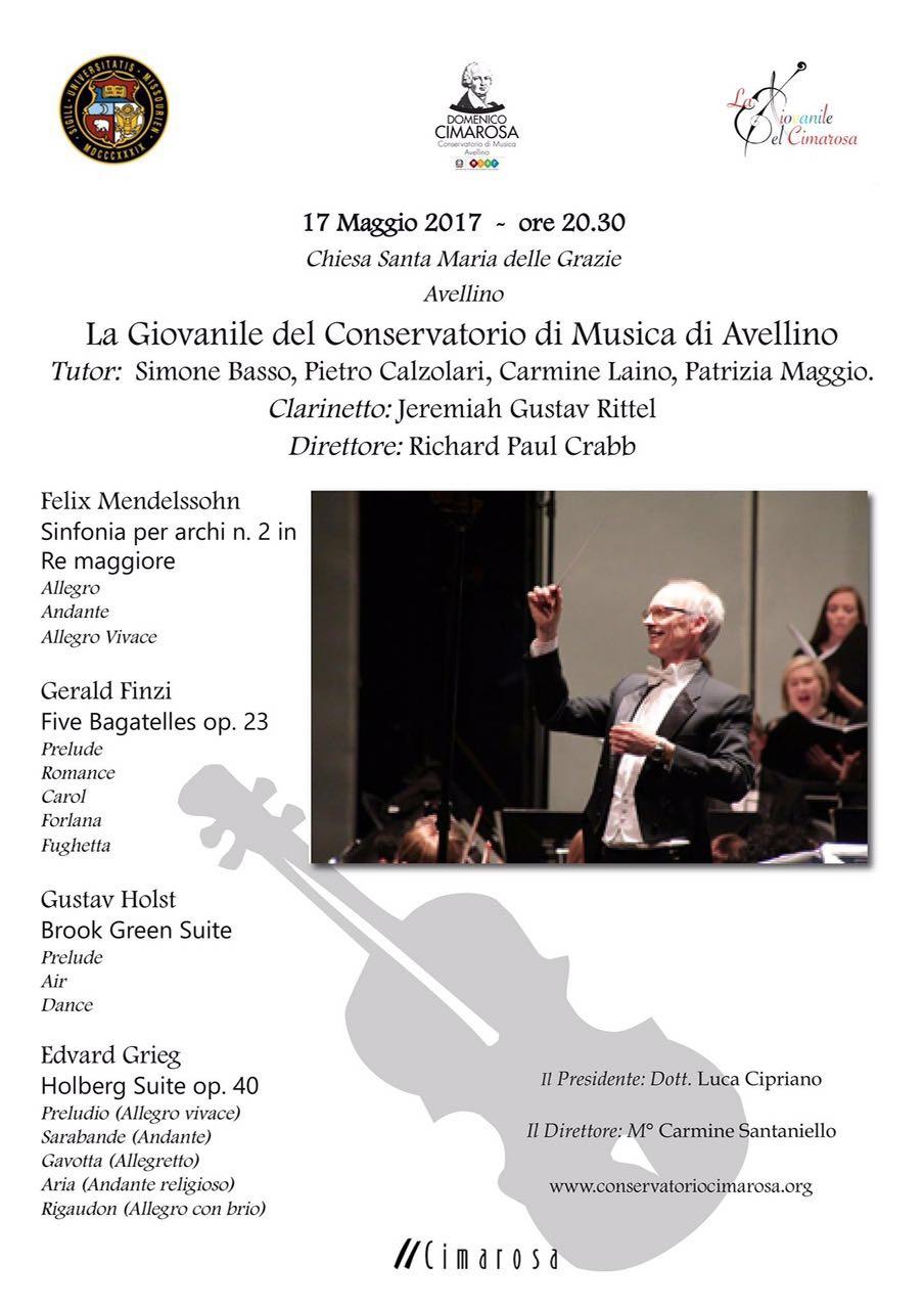 AVELLINO – Arriva dagli Stati uniti d’America un grande direttore d’orchestra, amico del Conservatorio e della città di Avellino. Si tratta di Richard Paul Crabb che domani, alle ore 20:30, nella chiesa di Santa Maria delle Grazie dirigerà l’orchestra giovanile del «Cimarosa» in un concerto d’eccezione sulle note di Mendelssohn, Finzi, Holst e Grieg.