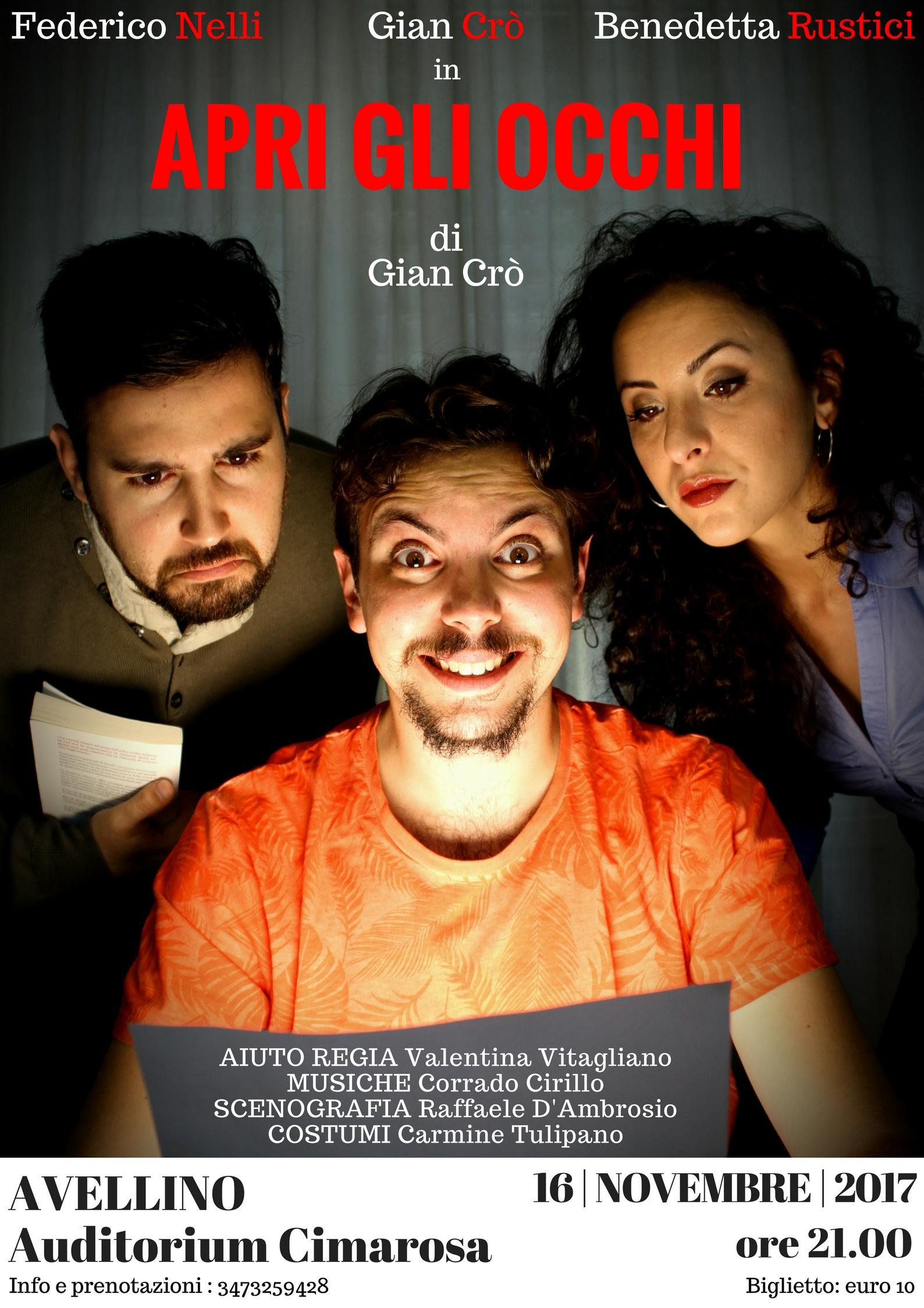 «Apri gli occhi» - si legge in una nota – è un testo inedito, intriso di commedia e allo stesso tempo capace di dare spazio all'amarezza e alla riflessione. La storia è incentrata sulle vicende di Alberto, un ragazzo che non ha ancora compiuto diciotto anni ma ha già una forte passione per il teatro, e due ricercatori bio medici, Antonio e Concetta. Lo scopo dei due sarà quello di appropriarsi in maniera subdola dell'eredità che pende sulla testa di Alberto dopo aver perso i suoi genitori in un incidente d'auto e il finale sarà tutto da scoprire, in un susseguirsi di azioni serrate e dinamiche, in uno stile che strizza l’occhio al montaggio cinematografico. Gli attori in scena sono Gian Crò, per l'occasione nelle vesti di autore, interprete e regista, che, nonostante la giovane età, vanta già collaborazioni importanti, Salemme su tutti, Benedetta Rustici, attrice toscana che ha lavorato con i registi più influenti della scena teatrale contemporanea e Federico Nelli, giovane accademico che ha avuto la possibilità di lavorare con Claudio Insegno e Marco Simeoli.