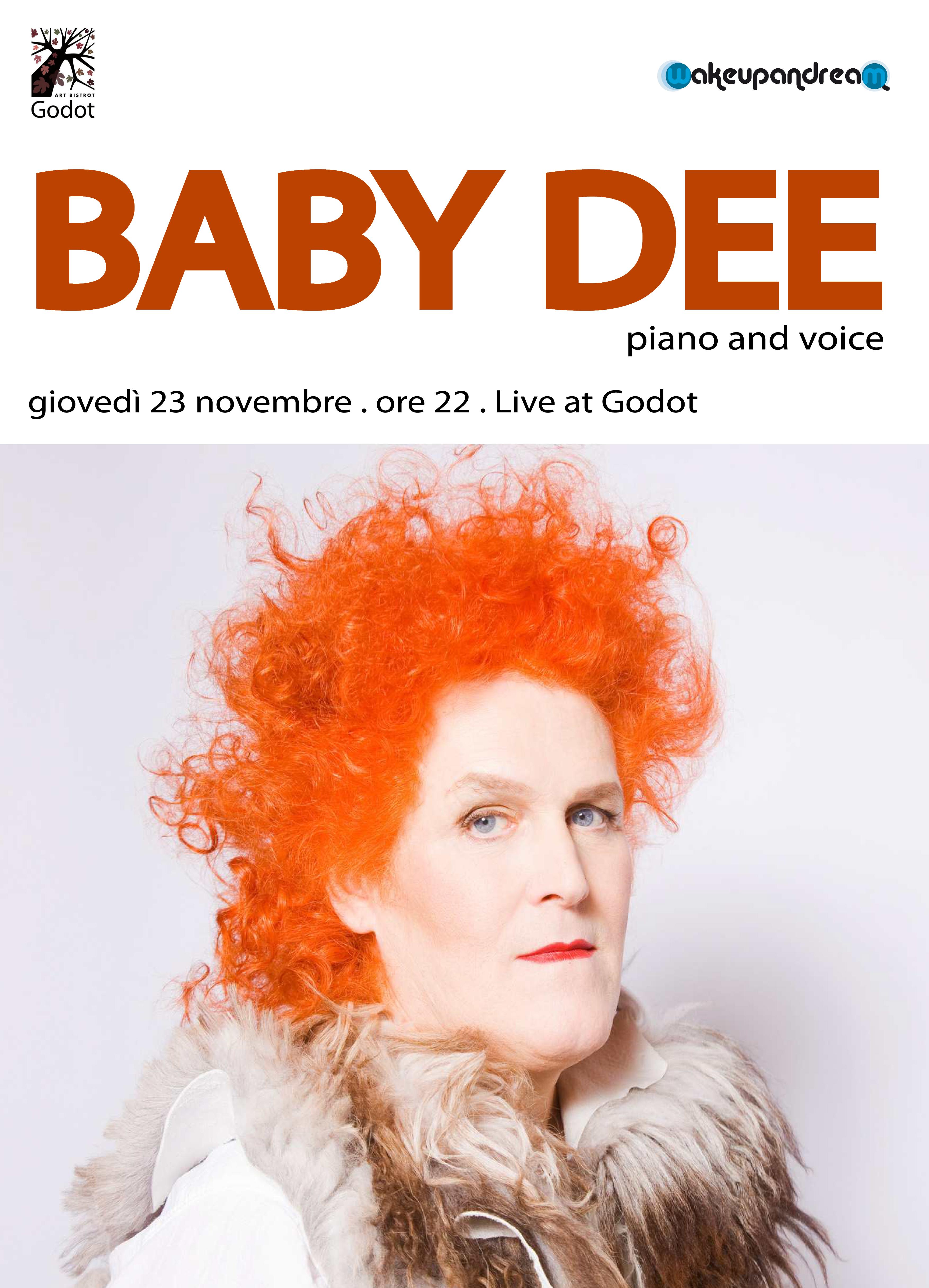 Classe 1953 – si legge in una nota – Baby Dee nasce in Ohio e si trasferisce a New York nei primi anni '70. Qui lavora come direttrice di un coro e insegnante di musica in una scuola cattolica. In seguito si unisce al Coney Island Sideshow Circus presentandosi con un enorme triciclo sormontato da un'arpa. Tornata a Cleveland lavora inizialmente come taglialegna per poi dedicarsi definitivamente alla musica. David Tibet dei Current 93 la scopre e produce il suo primo album, «Little Window» (2000), registrato a Cleveland e pubblicato dall'etichetta Durtro. Seguono alcuni album (uno di questi registrato dal vivo a Torino), sempre per la casa discografica di Tibet. Nel 2008 il passaggio all'etichetta Drag City, per la quale pubblica «Safe Inside The Day» e «The Robins' Song». Nel 2010 esce l'ispiratissimo «A Book of Songs For Anne Marie», rilettura di un suo precedente lavoro pubblicato nel 2004 in edizione libro+cd in tiratura limitatissima, solo 150 copie. Nel 2011 escono due album, «Regifted Light» e il doppio live «Baby Dee Goes Down to Amsterdam». Del 2012 è il cd «State of Grace» realizzato con Little Annie.