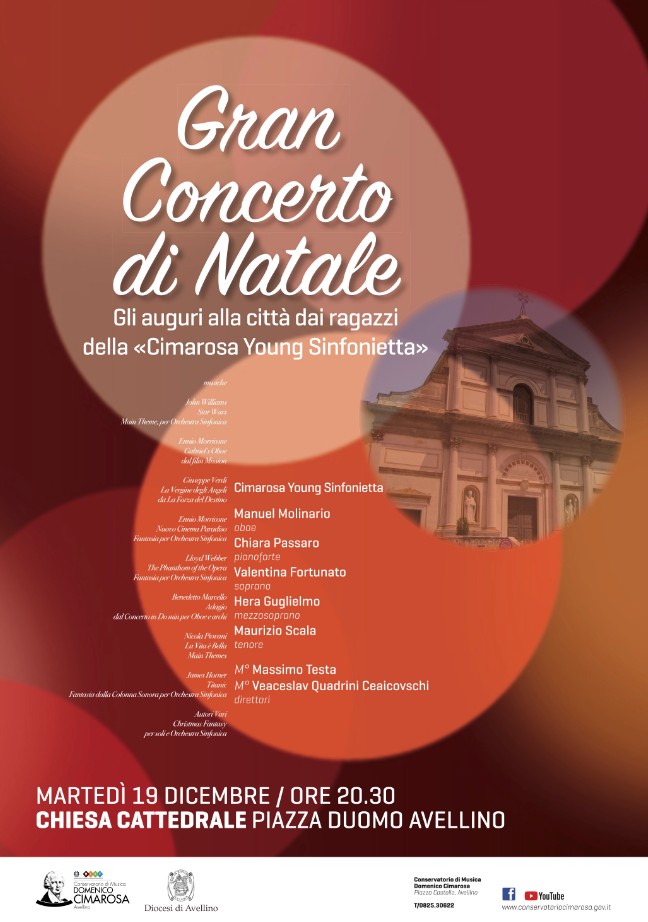 «L’appuntamento di domani, nella splendida location del Duomo di Avellino, sarà l’occasione – spiegano il presidente Luca Cipriano e il direttore Carmelo Columbro – per fare gli auguri alla città sulle note delle più belle melodie delle feste e le colonne sonore più amate del cinema internazionale. Con il Gran Concerto di Natale entriamo nel vivo degli eventi della rassegna “il Cimarosa suona bene” che accompagnerà il pubblico avellinese nel corso delle festività natalizie e fino alla fine di gennaio. Affidiamo ai giovani musicisti della Cimarosa Young Sinfonietta una ribalta importante perché crediamo nel loro talento e attraverso il laboratorio istituito due anni fa vogliamo valorizzarlo. Inoltre proseguiamo il lavoro avviato negli ultimi anni per far uscire il Conservatorio fuori dalle aule universitarie e portarlo tra la gente».