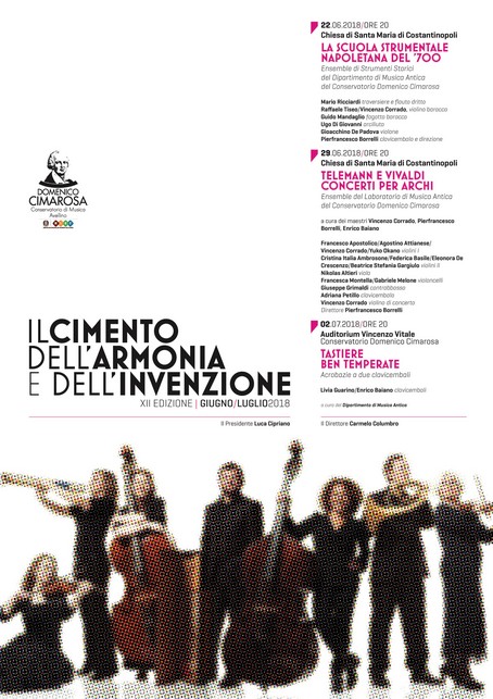Venerdì 22 e venerdì 29 giugno (ore 20), nella chiesa di Santa Maria di Costantinopoli e lunedì 2 luglio (ore 20), nell’auditorium di piazza Castello, torna «Il Cimento dell’Armonia e dell’Innovazione», rassegna concertistica dedicata alla musica antica, giunta alla XII edizione il cui titolo è tratto dalla famosa raccolta di concerti vivaldiani.