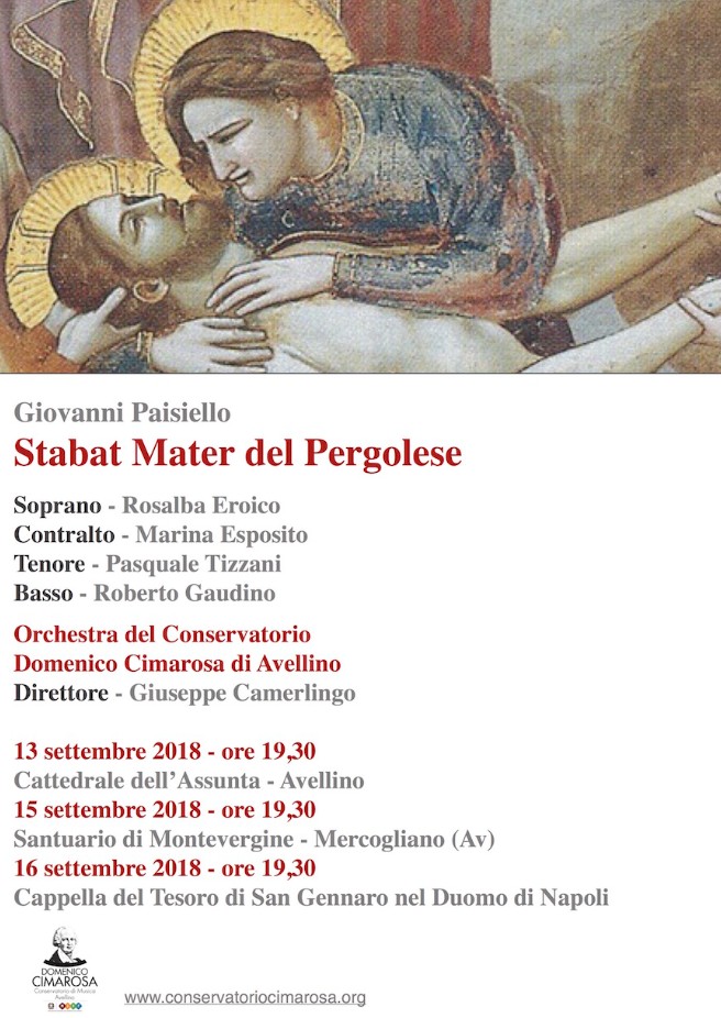 Giovedì 13, nella Cattedrale dell’Assunta di Avellino, sabato 15 al Santuario di Montevergine di Mercogliano e domenica 16 settembre nella Cappella del Tesoro di San Gennaro nel Duomo di Napoli verrà eseguito lo «Stabat Mater» di Gianbattista Pergolesi nella trascrizione del 1810 di Giovanni Paisiello. I tre concerti organizzati dal Conservatorio «Cimarosa», presieduto da Luca Cipriano e diretto da Carmelo Columbro, si terranno tutti alle 19:30 e saranno ad ingresso gratuito fino ad esaurimento posti.