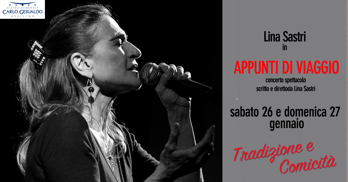 AVELLINO – Teatro, cinema, musica e tanto altro. Al “Carlo Gesualdo” di Avellino approdano gli “Appunti di viaggio” di Lina Sastri, un concerto-spettacolo scritto e diretto dall'artista napoletana che si racconta in una sorta di tour emozionale a tappe a ritroso nel tempo. L'appuntamento è per domani, sabato 26 alle 21.00 e domenica 27 gennaio alle 18.00. Con la Sastri sul palco del Massimo di Piazza Castello ci saranno Filippo d’Allio alla chitarra, Gennaro Desiderio violino, Salvatore Minale percussioni, Gianni Minale fiati, Salvatore Piedepalumbo fisarmonica e tastiere e Antonello Buonocore contrabbasso.