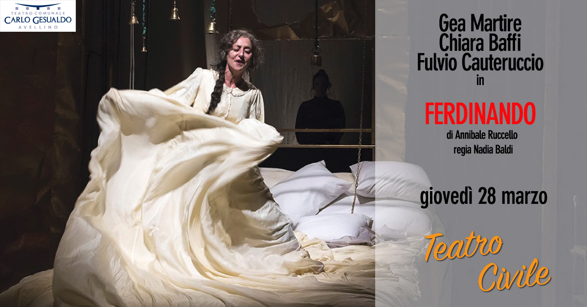 AVELLINO – Sul palcoscenico del Teatro “Carlo Gesualdo” di Avellino la rappresentazione teatrale in chiave ironica dei giorni successivi all'Unità d'Italia, visti da una nobile Borbone che fino a quel momento aveva goduto di agi e privilegi. Domani, giovedì 28 marzo, alle ore 21.00, va in scena “Ferdinando”, l'opera forse più famosa di Annibale Ruccello, per la regia di Nadia Baldi, che chiuderà il cartellone del “Teatro civile” al Massimo di Piazza Castello. Sul palco Gea Martire, Chiara Baffi e Fulvio Cauteruccio. L'opera – si legge in un comunicato – ha vinto due premi Idi: uno nel 1985 come testo teatrale, il secondo nel 1986 come miglior messinscena. In evidenza le follie e gli incroci amorosi che emergono come elementi contemporanei e moderni, insieme ai contrasti fra dramma e comicità.