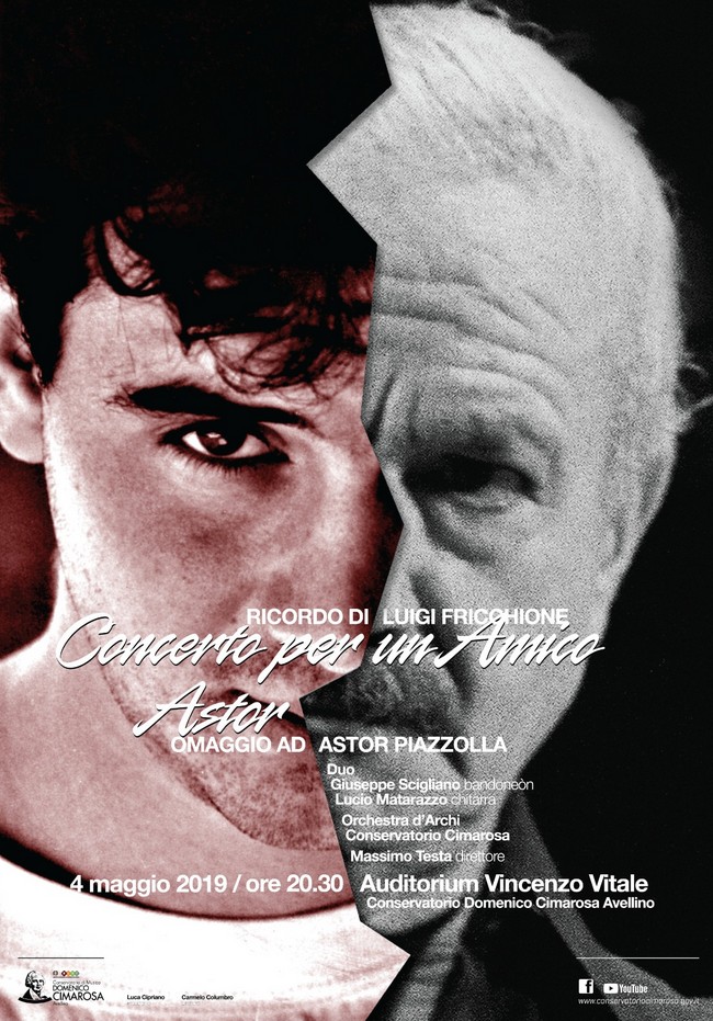 Domani, sabato 4 maggio 2019, alle ore 20:30, nella splendida location dell’auditorium di piazza Castello si terrà il «Concerto per un amico – In ricordo di Luigi Fricchione», un appuntamento che vedrà i maestri Giuseppe Scigliano (al bandoneòn) e Lucio Matarazzo (alla chitarra), protagonisti insieme all’orchestra di archi del «Cimarosa» diretta dal maestro Massimo Testa, del concerto ad ingresso gratuito fino ad esaurimento posti «Astor – Omaggio ad Astor Piazzolla».