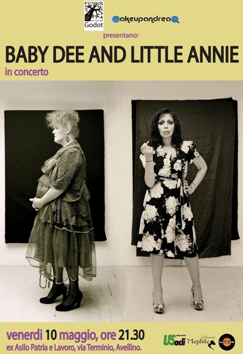 AVELLINO – Appuntamento imperdibile per tutti gli appassionati di musica, domani all’ex asilo «Patria e lavoro», in via Vasto ad Avellino, dove si esibiranno Baby Dee e Little Annie. L’evento è stato organizzato dal Godot art bistrot di Avellino, in collaborazione con la casa editrice Mephite e il negozio di dischi Camarillo Brillo. Il costo dell’ingresso è di 12 euro, i biglietti sono disponibili in prevendita proprio presso il Godot, in via Mazas, e da Camarillo Brillo, in via Mancini, ad Avellino.