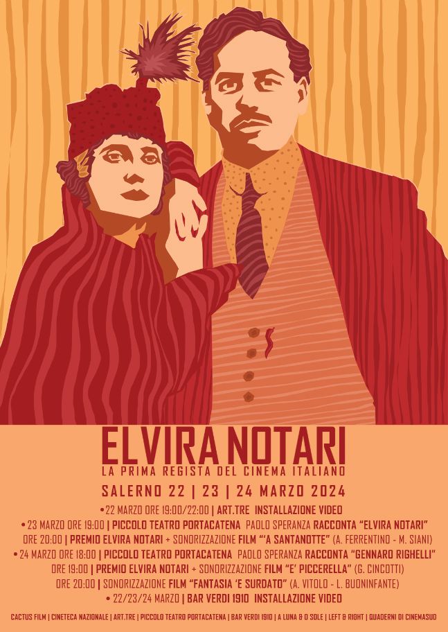 Al Piccolo Teatro Portacatena, a partire dalle ore 19 di sabato 23, al via la prima edizione del "Premio Elvira Notari" concepito per compositori di colonne sonore, studiosi di cinema ed operatori culturali che hanno sempre prestato attenzione al cinema muto ed in particolare alla figura della regista. Alle ore 20, spazio alla sonorizzazione del film “‘A santanotte” musicata da Alessandro Ferrentino e Maria Anna Siani. Cala il sipario domenica 24 marzo, dalle ore 18 e sempre al Piccolo Teatro Portacatena, con la sonorizzazione di due film: “E’ piccerella”, eseguita da Giosi Cincotti, e “Fantasia ‘e surdato”, musicato da Anacleto Vitolo e Luca Buoninfante.
