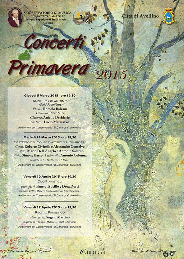 «I concerti di primavera – sottolinea il presidente del conservatorio Luca Cipriano – come d’abitudine inaugurano le attività concertistiche che fino ad ottobre il conservatorio “Cimarosa” dedica alla città e al suo affezionato pubblico. Tutti gli appuntamenti che si susseguiranno nel corso di una stagione che abbiamo immaginato più ricca che mai, verranno presentati nelle prossime settimane e sono sicuro che intercetteranno il gusto e il favore dei tanti appassionati di musica della provincia che vedono nell’Istituto superiore di studi musicali di via Circumvallazione un punto di riferimento imprescindibile per l’intrattenimento di qualità in città»