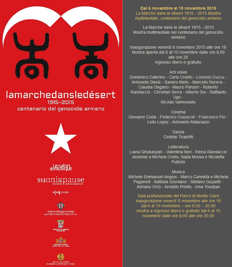 Così Elena Marcheschi (19. Invideo 2009) spiega il significato di VeraZnunt, il video del regista avellinese Antonello Matarazzo inserito nella mostra multimediale “La Marche dans le désert. 1915-2015”, che sarà inaugurata dopodomani, alle ore 18.00, nella sala polifunzionale del Parco di Monte Claro a Cagliari, nel centenario del genocidio armeno in cui vi fu un milione e mezzo di vittime. Cinque le sezioni, “Cinema”, “Arti visive”, “Musica”, “Letteratura”, “Danza”, in cui sarà distribuita la mostra – patrocinata dalla Provincia di Cagliari e dall’ambasciata armena di Roma – cui daranno il loro contributo 35 artisti provenienti da vari Paesi.