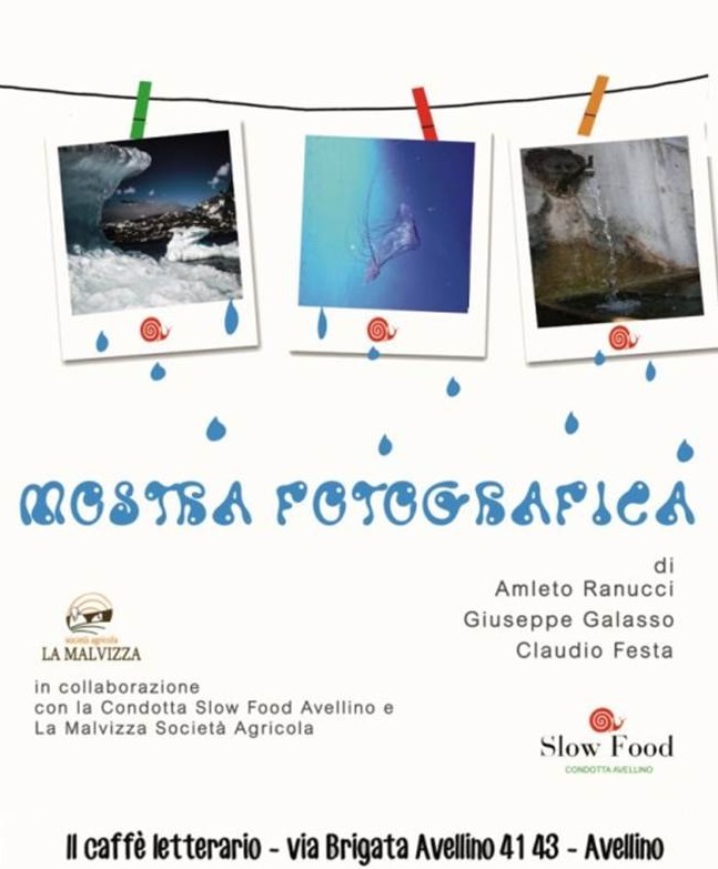 AVELLINO – Sarà l’acqua il tema ispiratore della mostra fotografica organizzata dalla condotta di Avellino di Slow Food e dalla società agricola La Malvizza e in allestimento presso il Caffè letterario di via Brigata Avellino dove sarà inaugurata il prossimo 23 gennaio alle ore 19.00. In esposizione le foto di Amleto Ranucci, Giuseppe Maria Galasso e Claudio Festa.